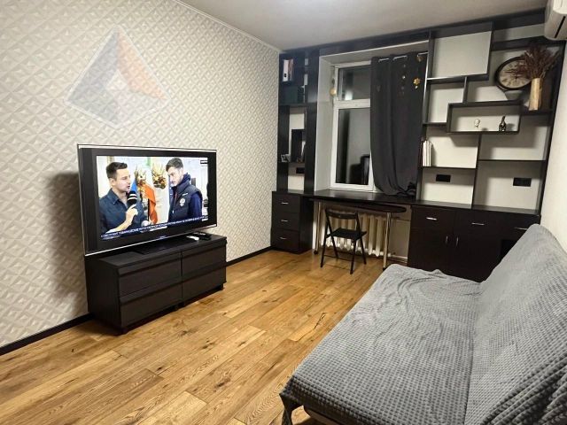 Гостиная и прихожая. Шкаф купе встроенный для верхней одежды и обуви. Диван Anderssen Дискавери, раскладывается на всю комнату, бар в виде глобуса, телевизор Samsung. Карниз для штор с электроприводом (пульт). Люстра и бра Maytoni (хрусталь, Италия). Шторы, пуф. кондиционер Mitsubishi.
