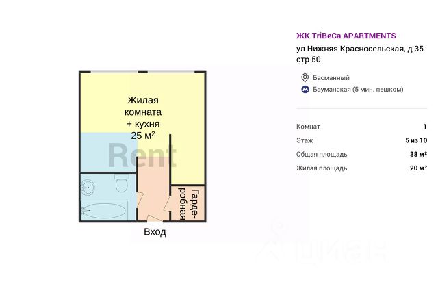 Аванса НЕТ, это ошибка ЦИАНа!!!!! Сдаётся квартира, в ЖК TriBeCa APARTMENTS на 4 этаже, общей площадью 38,4 кв.м. ЖК расположен в тихом уютном районе Москвы в шаговой доступности от двух станций метро и всей необходимой инфраструктуры, в том числе и на территории ЖК, включая: рестораны/кафе, магазины, салоны красоты, спортивные залы, детский бассейн, аптеки и многое другое необходимое для жизни и отдыха! В апартаменте произведен дизайнерский ремонт с использованием качественных и экологичных материалов! В наличии вся необходимая мебель и бытовая техника. Планировочное решение позволяет отделить зону отдыха от гостиной и кухни. В ЖК круглосуточная охрана, видеонаблюдение и закрытая внутренняя территория