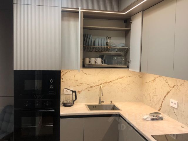 Кухня компактная и функциональная: верхние шкафы с антресолями для хранения, кран с фильтром для питьевой воды, вместительные ящики и полки в нижней части гарнитура, большая раковина, подсветка, фартук из итальянской керамики. В столешницу встроена розетка-тройник.