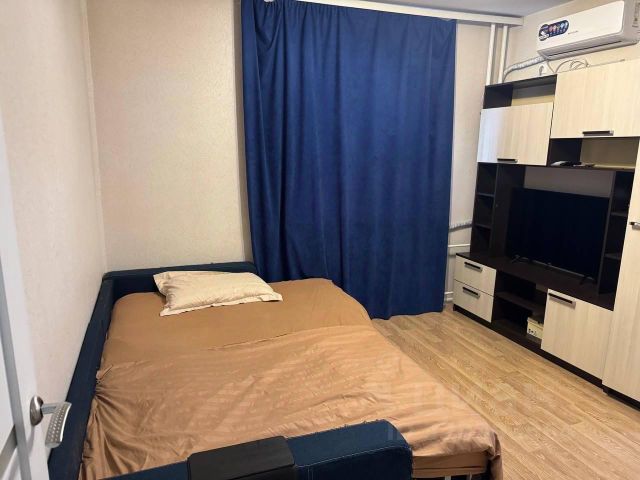 Сдается студия. В квартире сделан качественный ремонт. Кухня встроенная. Кровать полутораспальная с ортопедическим матрасом (ширина 140 см) . Шкаф. Санузел совмещенный в плитке. СМА. В квартире установлен кондиционер. У собственника есть требования к арендатору. Животные обсуждаются.