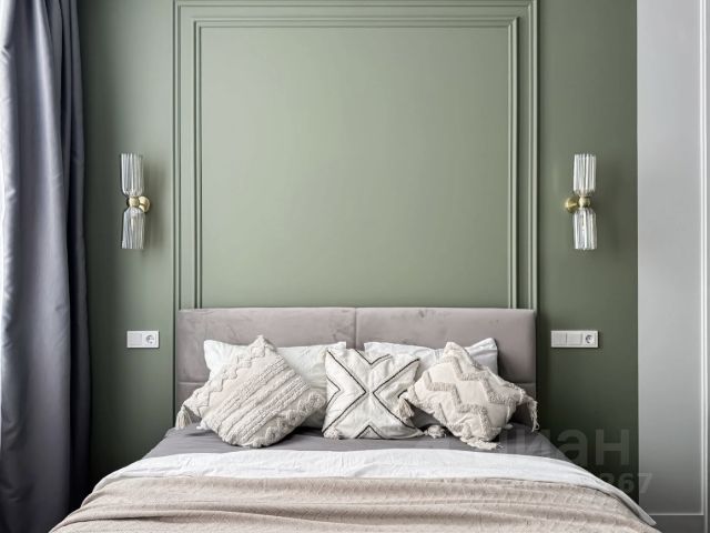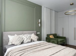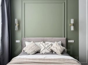Интерьер квартиры выполнен в современном минималистичном стиле. Высокие потолки, аккуратные молдинги и спокойная палитра — белые, кофейные и оливковые оттенки — создают ощущение легкости и уюта. Пространство грамотно зонировано: удобно отдыхать, принимать гостей и хранить вещи.