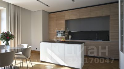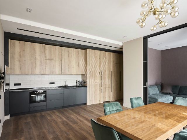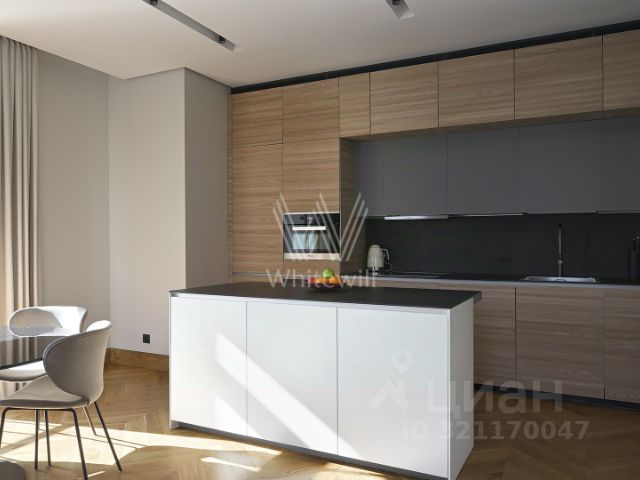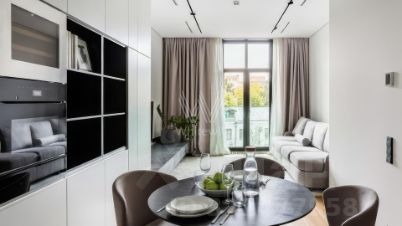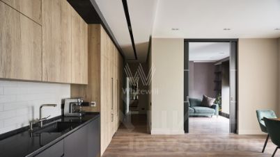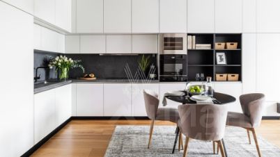 Светлые оттенки гостиной служат безмятежным фоном для разных сценариев. Лаунж-зона с мягким диваном приглашает провести вечер за книгой или сериалом. Окна выходят на тихую зелёную улицу, предлагая прогулку между городскими усадьбами и садом Баумана. Кухня, скрытая в стильном гарнитуре, отвечает на любые запросы: омлет со шпинатом на завтрак, запечённая цветная капуста с тахини на ужин и травяной чай для чтения новостей. Мебель вытягивается в единую линию, чтобы взгляд, ищущий горизонт, не встречал преград.
