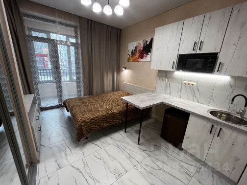 В студии сделан дизайнерский ремонт. Для комфортного проживания есть БОЛЬШАЯ встроенная КУХНЯ с барной стойкой и регулируемой подсветкой, рабочее место, большой диван с множеством подушек.