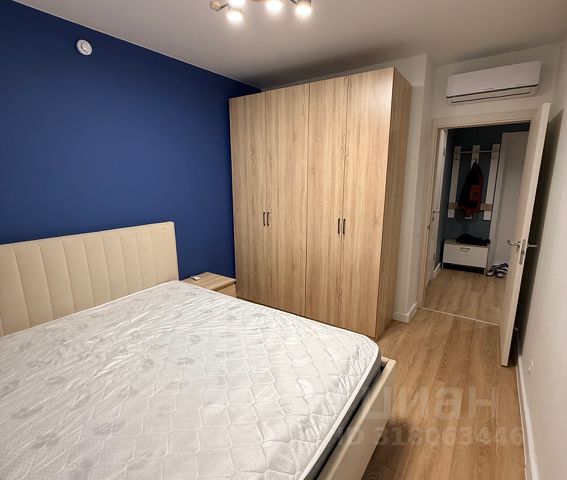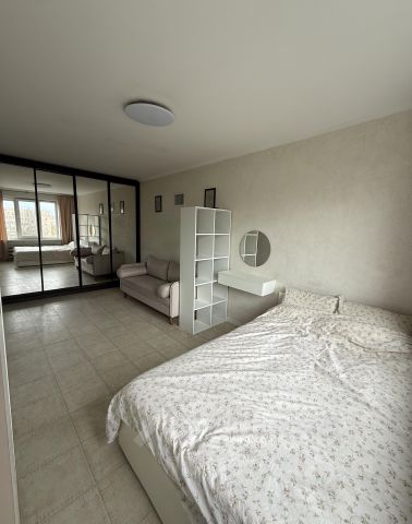 Кровать 140200 с хорошим двусторонним матрасом и подъёмным механизмом. Шкаф-купе во всю стену с зеркалами. Плюс распашной шкаф, комод, и стеллаж. Стильный и удобный диван (не раскладной, длина позволяет спокойно лечь одному человеку). В комнате установлен кондиционер (обслужен, почищен, хорошо работает, есть тихий ночной режим). Блэкаут-жалюзи и шторы. Всего 9 розеток.