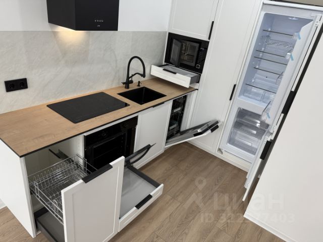 - Техника: варочная панель, холодильник, посудомойка, микроволновка на выкатной полке, чайник, помпа для воды, стиральная машина с сушкой, гигиенический душ, фен, утюг.
