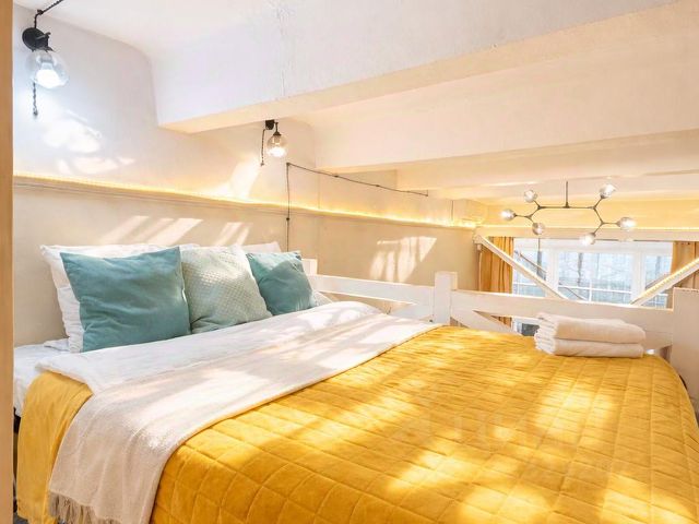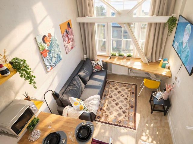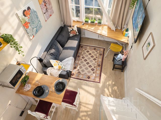 Это двухуровневая квартира-студия, общей площадью 28 кв.м (площадь по полу 19 кв.м.+ 9 кв.м. второй уровень). Потолок, высотой в 4,5 метра и большие светлые окна не смогут оставить вас равнодушными.