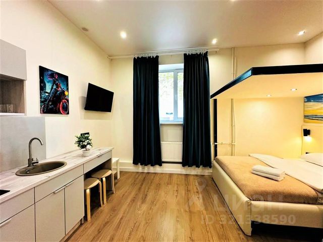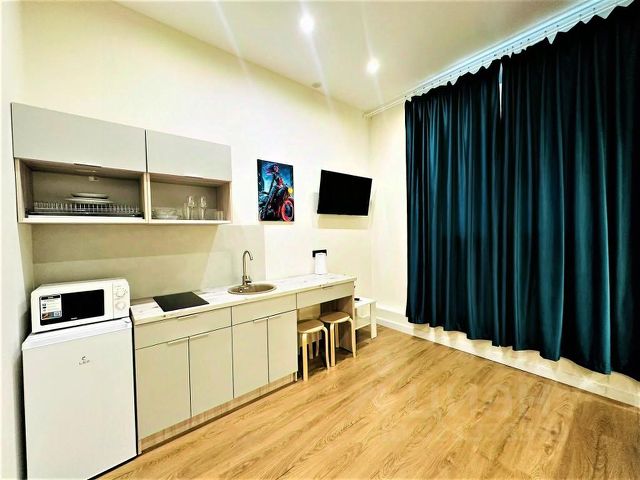 Небольшая, но функциональная квартира-студия. Да, со спальным местом на втором уровне квартиры, с подъемом по лестнице. Она, кстати, очень удобная, по ней легко подниматься, достаточно редкими, широкими ступеньками + перила, поэтому дорогие гости, не смущайтесь этому. Потолок не сильно низкий и не сильно высокий, он не в полный рост, но там комфортно находиться и отдыхать, смотреть телевизор (Smart TV)