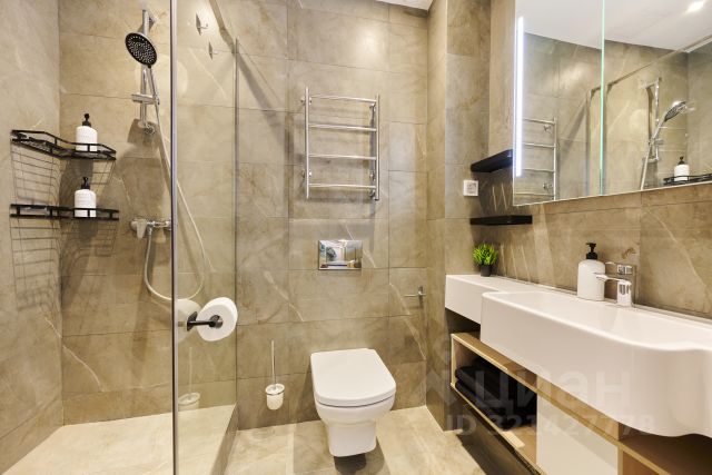 В ванной комнате душ, туалет, раковина, зеркало, шампунь, полотенцесушитель, зубные щетки и мыло для рук, полотенце для ног