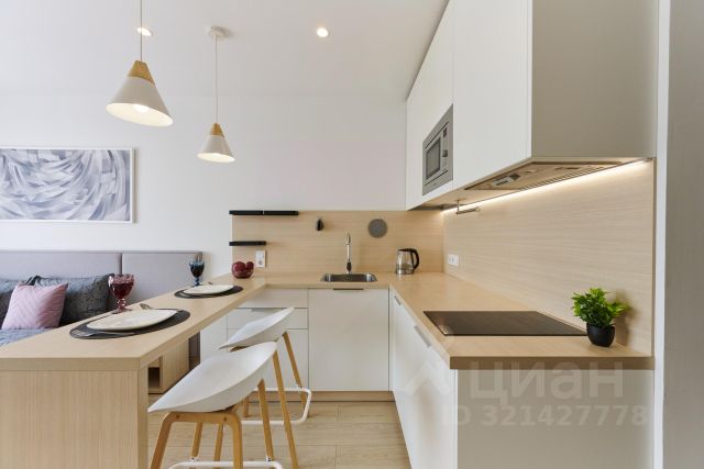 Кухня с чайником, фильтром для воды, индукционной плитой, кастрюлей, сковородкой, столовыми приборами, штопором, кружками, бокалами для вина, стаканами, ножами, холодильником с морозилкой, микроволновкой. + чай, сахар, кофе
