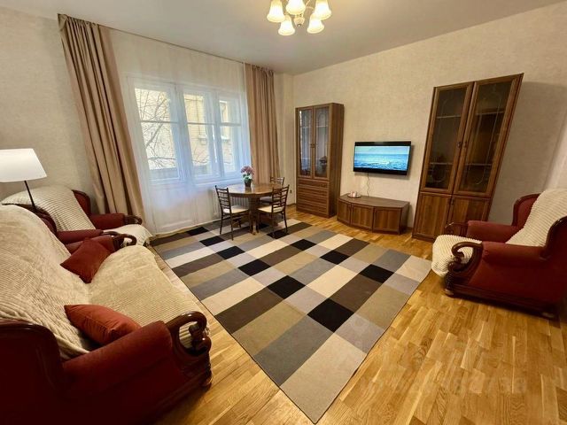 Стильная двухкомнатная квартира на Тверской в Сталинской доме. С балкона гостиной открывается потрясающий вид на Тверскую улицу и на Москву. Окна выходят на Тверскую улицу и во двор. Квартира площадью 70 кв метров с потолками 3, 5м со стильной гостиной и уютной спальней идеальна подходит как для семейного отдыха так и для деловых поездок. В пешей доступности 5 станций метро. Апартаменты находятся в 5 минутах неспешной ходьбы от Красной Площади и Кремля! Квартира полностью оборудована современной техникой: три ЖК телевизора, DVD плеер, колонки, стиральная машина, фен, утюг. Для Вашего удобства в одной из комнат оборудовано рабочее место с компьютерным креслом и столом. Кухня оснащена холодильником, вытяжкой, варочной панелью, духовым шкафом, тостером, чайником, микроволновой печью, комплектом посуды и столовых приборов, а также кастрюлями и сковородами.