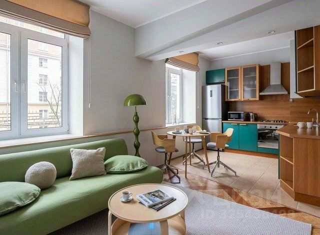 Просторная гостиная с кухонной зоной, где расположен диван 90х200, рассчитанный на 1го гостя, спальня с двуспальной кроватью 160х200, также имеется детская кроватка, и просторная светлая ванная комната. Общая площадь составляет 60 кв. м