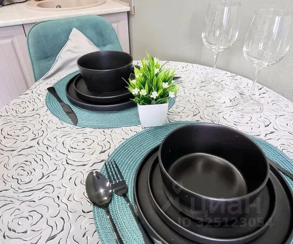 В кухонной зоне установлена варочная панель, чайник,духовой шкаф, фильтр для воды, посудомоечная машина, холодильник, а также имеется необходимая для приготовления и приёма пищи посуда.