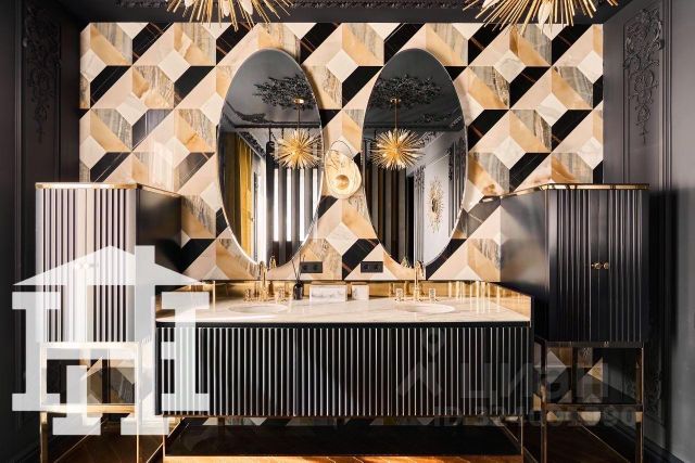 Ванная комната с самой модной в мире сантехникой Antonio Lupi из серии "раковина из чёрного стекла за миллион", наливными полами из акрила, душевой кабиной Gessi и люстрой Foscarini от дизайнеров Patricia Urquiola, оснащена прачечной с техникой Miele.