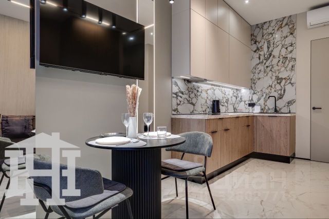 Встроенная техника, стеклянный шкаф с посудой, круглый стол на шесть персон и мягкий диван с раскладным механизмом - всё уже готово к повседневности и праздникам. Атмосферу меняет сценарное освещение: одним нажатием пространство становится то ярким и рабочим, то мягким и вечерним.