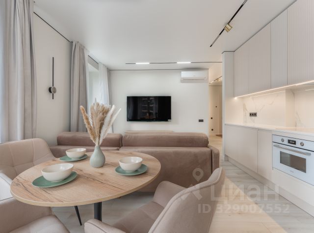 - мебель: двуспальная кровать с подъемным механизмом и матрасом, прикроватные тумбочки, встроенный шкаф купе в спальне (60 см глубина), шкаф в прихожей, диван тканевый (раскладывается в полуторное спальное место), рабочий стол и стул, обеденный стол со стульями, стеллаж в гостиной, зеркало, туалетный столик, пуф, мебель в ванной