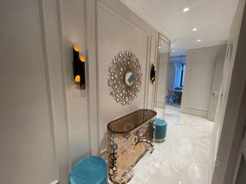 Просторный холл с зеркалом с подсветкой и встроенными шкафами