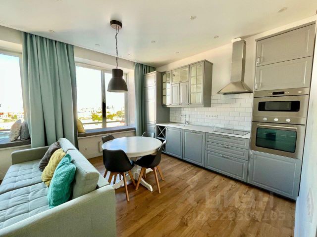 Кухня- настоящий рай для кулинара - оборудована практичной мебелью с встроенной техникой: варочная панель, духовка, вытяжка, посудомоечная машина (все -Electrolux), холодильник Liebherr. Кухня соединена с гостиной (17.7 кв.м), где разместились обеденный стол и гостевой гобеленовый диван, кондиционер, возможно установить телевизор и аудиосистему.