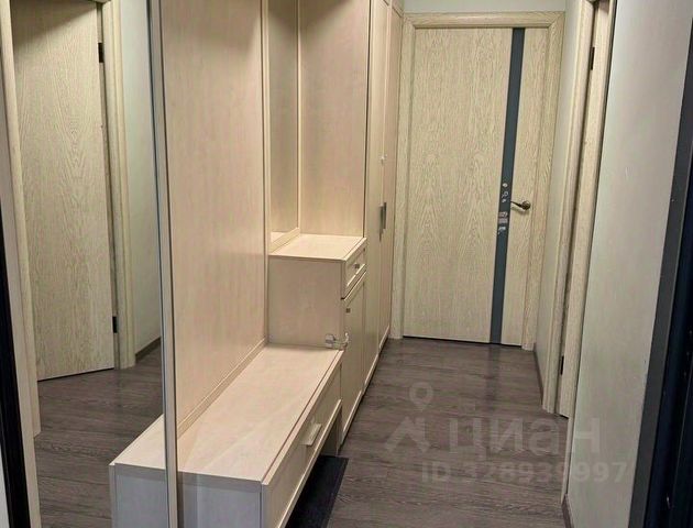 Просторная коридорная зона с большим количеством встроенных зеркальных шкафов.