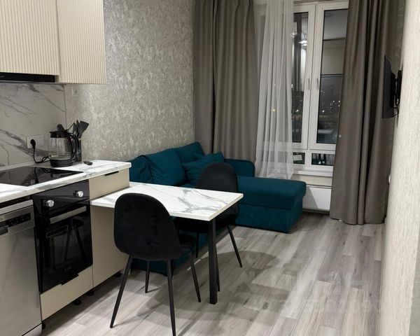 - кухня-столовая-гостиная: диван двуспальный раскладной, встроенный кухонный гарнитур с обеденной зоной: варочная панель, духовой шкаф, посудомоечная машина, вытяжка, микроволновая печь, холодильник, телевизор, кондиционер будет установлен до сдачи, чайник, водяной фильтр, обеденные полу барные стулья, посуда;