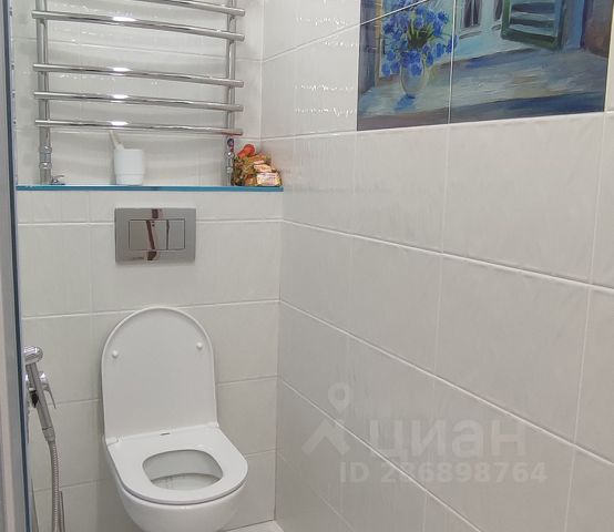 Санузел совмещенный: площадь 2.9 кв.м, пол плитка, стены плитка до потолка, ванная, унитаз, стиральная машина полуавтомат, зеркало, сантехника, сушилка для белья.