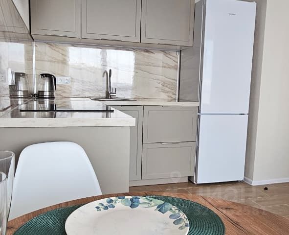 кухонный гарнитур, керамическая плита, духовка, микроволновка, чайник, большой холодильник, кухонный стол, стулья, посудомойка;