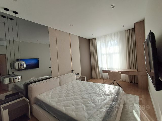 Спальня 3 - гардеробная с системой хранения, кровать King Koil (премиум класс) с мягким изголовьем, прикроватные тумбочки, пуфик с зеркалом оформленные под туалетный столик, телевизор Hartens, шторы велюр. Лоджия оборудована системой хранения горнолыжного оборудования.