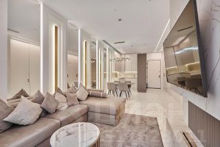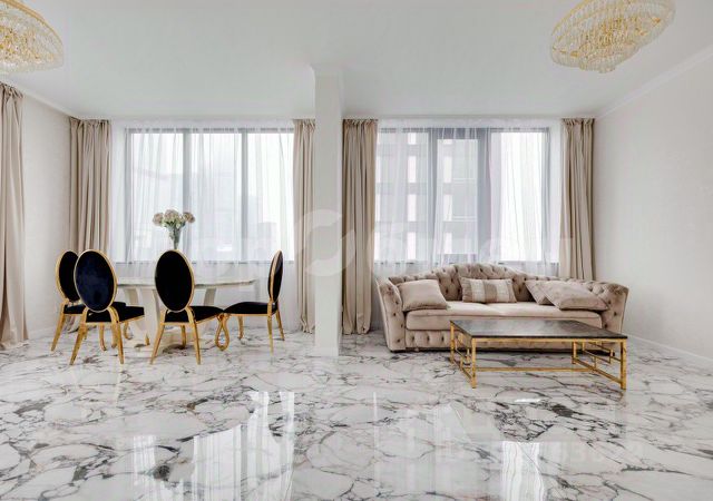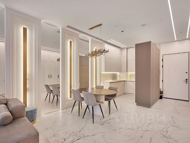 С высоты двадцать второго этажа вид на набережную и город, где на горизонте соседствуют современные и сталинские высотки, кажется сказочным. Внизу — стильная современная прогулочная зона от архитектурного бюро Wowhaus. Внутри квартиры — все оттенки жемчуга, подобные отблескам реки за окном.