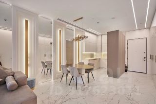 Просторная кухня-гостиная решена в серой гамме. Светлые стены и большие окна усиливают впечатление легкости и воздушности. Лаконичная кухня, сочетающая гладкие и ребристые фасады, отражает настроение реки — то спокойной, то порывистой. Вместительный диван отвечает перламутровым серым блеском с противоположной стороны гостиной, настраивая на безмятежность. Днём пространство наполняется естественным светом, а вечером в окнах мерцают огни "Москва-Сити".