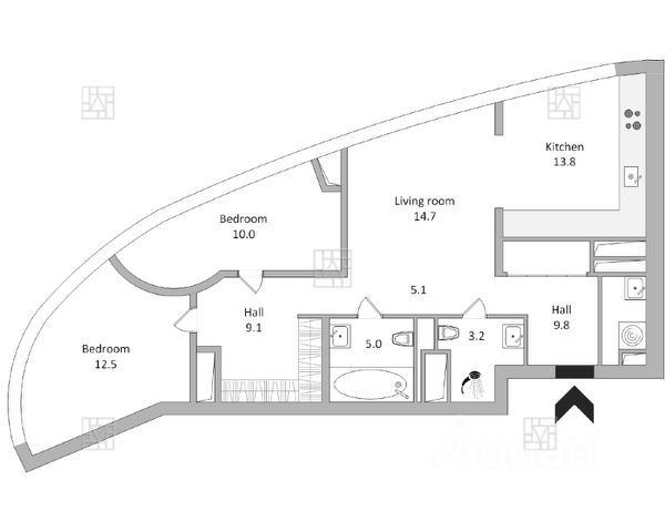 Просторная кухня, совмещенная с гостиной, спальня, кабинет, 2 сан узла с ванной и душевой кабиной, гардеробная, встроенные шкафы. В прихожей отдельная хозяйственная зона с технической раковиной, стиральной и сушильной машинами, бойлером. Кухня полностью укомплектована встроенной бытовой техникой (Neff, Liebherr, Bosch, Bone Crusher), установлены встроенные фильтры питьевой воды.