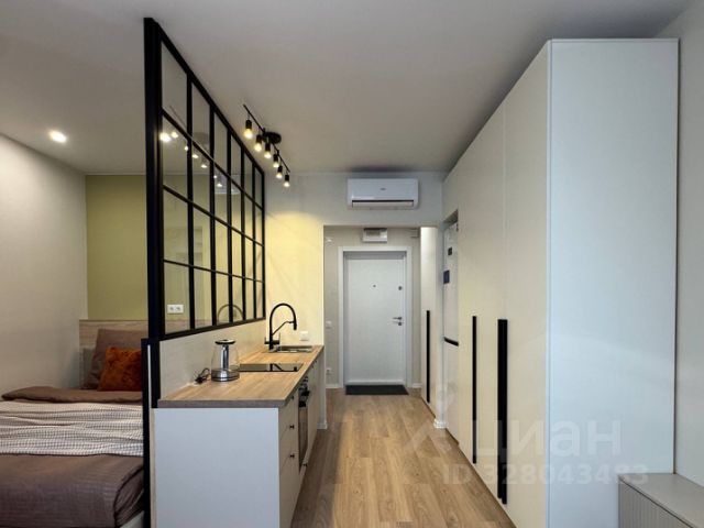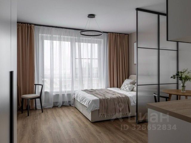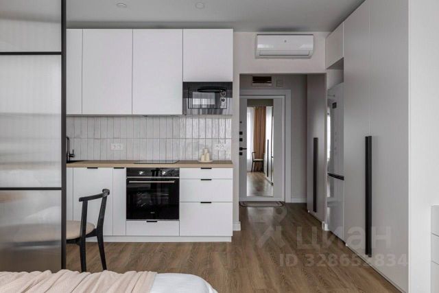 В прихожей огромный глубокий зеркальный шкаф-купе с двумя отсеками со штангами для длинных и коротких вещей. Также в шкафу есть обувница и места для хранения обуви + в пуфике также место для 4 пар обуви. В ванной стиральная машина с сушкой Hotpoint на 7 кг, полотенцесушитель с тремя режимами нагрева и таймером, огромное зеркало с подсветкой и подогревом, душевая кабина, тумба с корзиной для белья, тумба для средств для стирки и других принадлежностей, подвесной шкаф и настенная складная сушилка. В комнате сплит система LG на 36кв.м, тихая и очень мощная. Холодильник Beko Total No Frost с тихим инверторным компрессором. Кухня со встроенной техникой. Мощной и тихой вытяжкой, при этом сохранена естественная вентиляция помещения, что является одним из важнейших параметров вашего комфорта (в комнате всегда будет свежий, чистый воздух, достаточно кислорода и никаких запахов) + наличие двух окон разного размера поможет вам настроить свой желаемый идеальный микроклимат. На кухне встроенная варочная панель, полноразмерная духовка Haier с 16 режимами приготовления, множество современных функций, конвекция; очистка паром; доводчик двери; управления со смартфона и т.д. Также посудомоечная машина, микроволновая печь, эл. чайник, блендер, тостер, посуда и очень много различных кухонных принадлежностей. Большая кровать 160х200 с ортопедическим основанием, матрасом Askona и нишей для хранения. Беспроводной пылесос, утюг и гладильная доска. Все остальное можно увидеть на фото и видео. Все в идеальном состоянии, жила и живет пока одна девушка меньше года. При желании интерьер можно дополнить креслом, рабочим местом, либо чем-то еще.