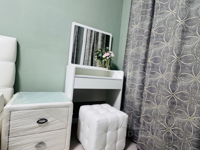 В спальне - двуспальная кровать, удобное кресло, напольное зеркало, комод, прикроватный столик.