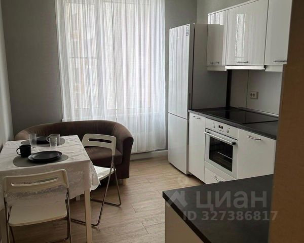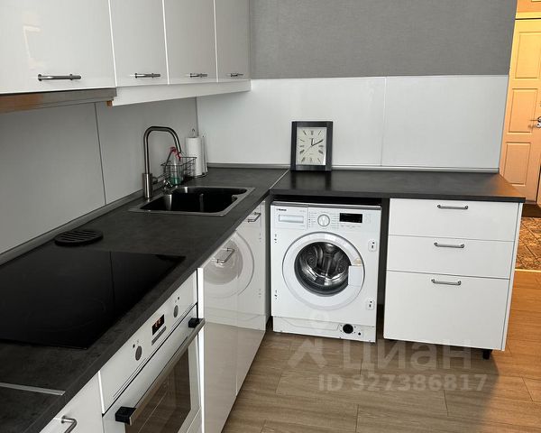 На кухне: кухонный гарнитур с необходимой техникой (варочная панель, духовой шкаф, вытяжка, встроенный холодильник, микроволновая печь, электрочайник, стиральная машина), раскладной диван, стол, стулья, телевизор.