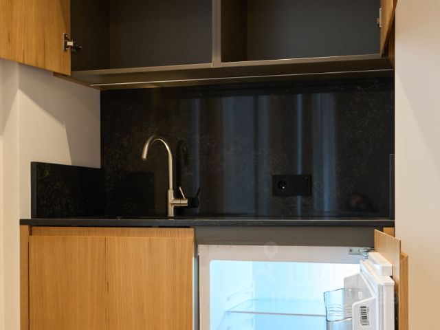 Описание интерьера Стильная студия с продуманным дизайнерским интерьером. Пространство зонировано стеклянной перегородкой с рифлёным стеклом, что создаёт ощущение отдельной спальни при сохранении света и воздуха. Интерьер выполнен в спокойной современной палитре: натуральное дерево, нейтральные оттенки, акцентные элементы. Кухня с интегрированной техникой, функциональная гостиная зона, панорамные окна наполняют квартиру светом и подчёркивают ощущение пространства. Квартира полностью готова к комфортному долгосрочному проживанию.