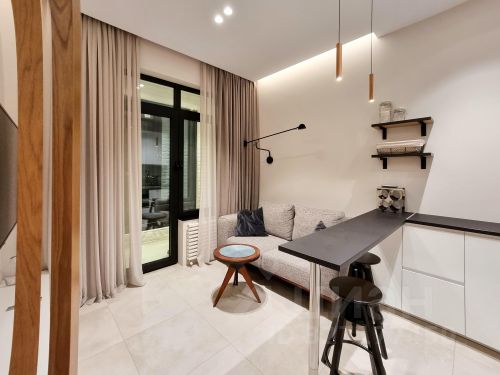 В апартаментах выполнен первоклассный дизайнерский ремонт с с иcпользoванием премиальных отделочных материалов. Несмотря на небольшую площадь апартаментов, продуманная до мелочей планировка с удобным зонированием, позволит Вам использовать пространство с максимальным комфортом. Все очень функционально!!! Каждая логическая зона акцентирована. Выделены все основные зоны и сохранен единый объем пространства. ПАНОРАМНОЕ ОСТЕКЛЕНИЕ позволяет насладиться городскими пейзажами. Надежные немецкие стеклопакеты "Schuco" *ШУМА ЖД не слышно.