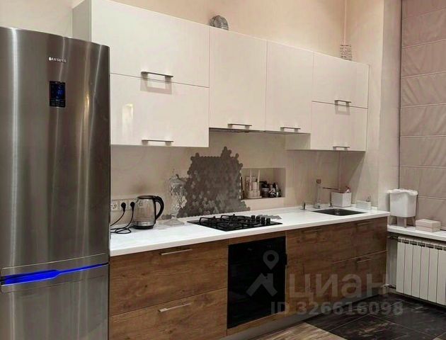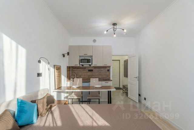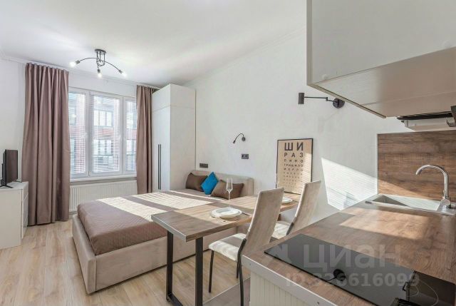 Уютная студия в красивом новом доме. Хороший ремонт, вся мебель для комфортной жизни: диван с ортопедическим матрасом Аскона, "Стильные кухни", посудомойка, большой бесшумный холодильник. Кладовка напротив двери, оборудована гардеробной системой. Сдается на длительный срок