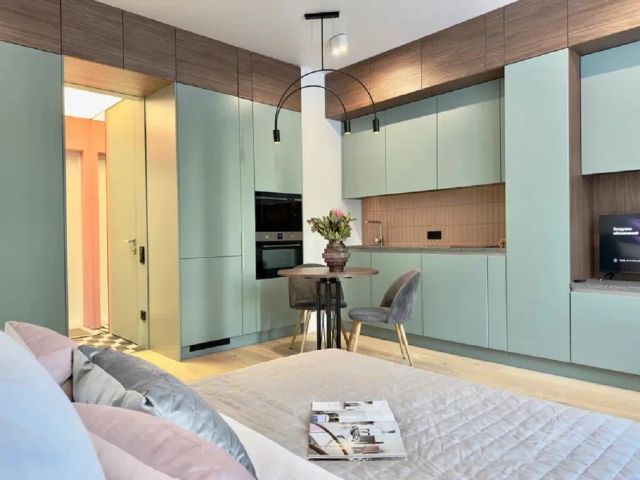 В апартаментах возможно размещение до 2 гостей, спальное место - двуспальная кровать. Студия полностью меблирована и оборудована всем необходимым для комфортного проживания: бесплатный wi-fi, постельные принадлежности, фен, телевизор, небольшая кухня (холодильник, микроволновая печь, чайник, электрическая плита, посуда).