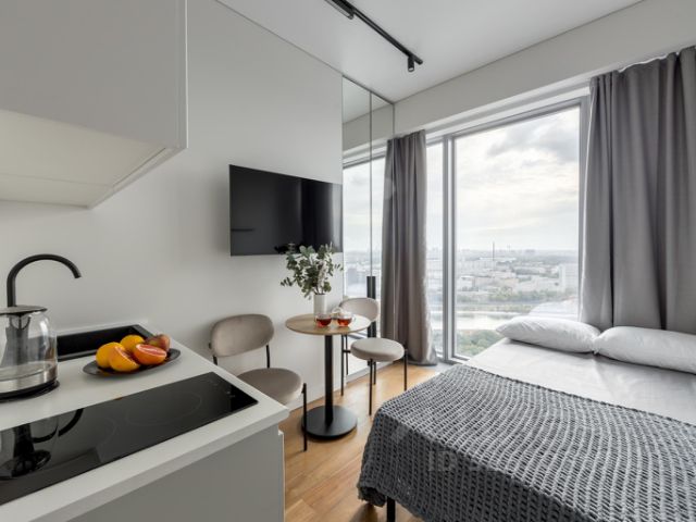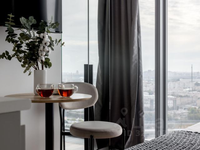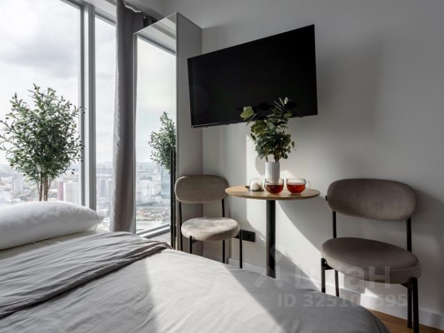 Кухонная зона, оснащенная новейшей техникой, представляет собой мечту гурмана. Здесь легко можно создавать кулинарные шедевры различной степени сложности, а обеденная группа на четыре гостя станет идеальным местом для дружеских встреч и торжеств. Завораживающий вид из окон, открывающийся на весь город, создает неповторимую атмосферу уюта и вдохновения.