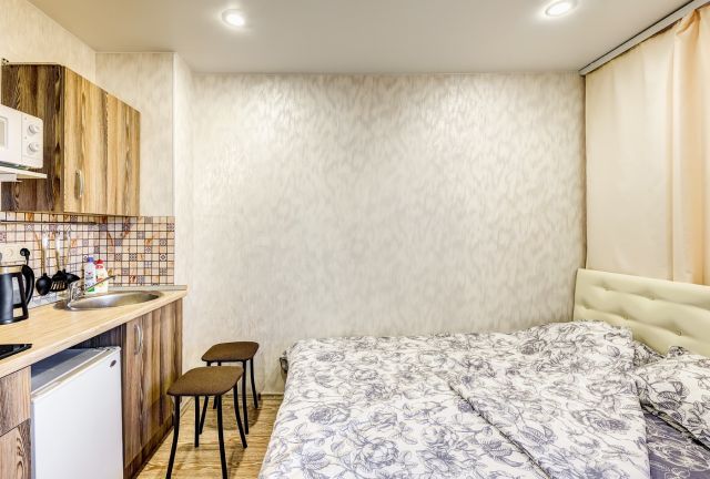 Кухня с посудомойкой (таблетки в наличии), чайником, фильтром для воды, индукционной плитой, кастрюлей, сковородкой, столовыми приборами, штопором, кружками, бокалами для вина, стаканами, ножами, холодильником с морозилкой, микроволновкой, столом для обеда, двумя стульями. + чай, сахар, кофе