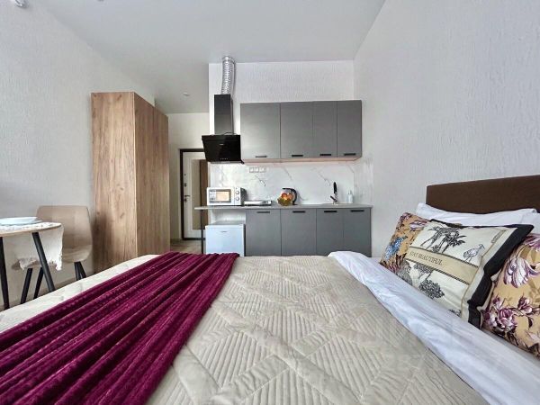 В зоне гостиной — удобный мягкий диван и тв с выходом в интернет.