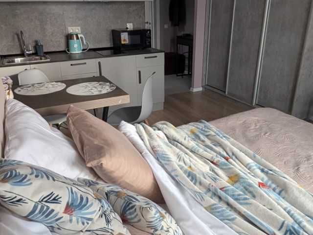 Общая площадь 23,6 кв. м. (включая лоджию). Уютная кухонная зона. Квартира полностью обустроена и меблирована для комфортной жизни. Светлая комната, с уютной обстановкой и новой мебелью. Кухонная зона оснащена всем необходимым, с встроенной техникой (посудомоечная машина, духовой шкаф, встроенный холодильник, электрическая плита, чайник, электрический полотенцесушитель, кондиционер, стиральная машина, телевизор). В квартире - вся техника и мебель новые, никто не пользовался. Застекленная лоджия. Металлическая дверь. Стеклопакеты. Напольное покрытие: плитка, ламинат.