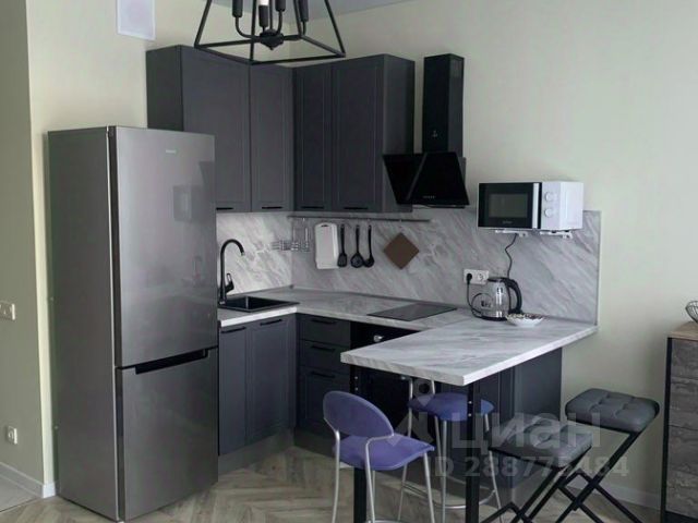 В кухной зоне есть мебель, варочная программируемая электроплита, электрочайник, встроенная вытяжка и СВЧ-печь.