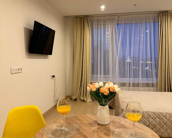 Видовая квартира. Предлагаю вашему вниманию просторную студию в новом доме, построенном в 2024 году. Квартира находится на последнем 41-м этаже, что обеспечивает потрясающий вид на город. Общая площадь студии — 25 кв. м, жилая — 18 кв. м, кухня — 7 кв. м. Высокие потолки в 3 метра создают ощущение простора и свободы. Квартира с евроремонтом, где продумано все для вашего комфорта. В комнате и на кухне есть вся необходимая мебель. Кухня оборудована современной техникой: кондиционер, холодильник, посудомоечная машина, стиральная машина и телевизор. В ванной комнате установлена душевая кабина, что дополнительно экономит пространство. Дом, в котором расположена квартира, новый и современный. Для вашего удобства имеются пассажирский и грузовой лифты. Окна квартиры выходят во двор, что обеспечивает тишину и спокойствие. В доме проведен интернет, а значит, вы всегда будете на связи. Всего в 11 минутах пешком находится станция метро, что позволяет легко добраться до любой точки города. В шаговой доступности есть все необходимое для комфортной жизни: школы, детские сады, клиники и магазины. отдельно оплата по счетчикам. Залог 80 000. комиссия 50 процентов. квартира идеально подходит для одного-двух человек. Приглашаем вас на просмотр! Звоните и записывайтесь на удобное для вас время. Не упустите шанс арендовать эту уютную студию в новом доме!