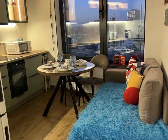Функциональная однокомнатная квартира, рассчитана на две пары проживающих. В комнате двуспальная кровать, двуспальный диван-раскладушка, большой телевизор с тумбой, шкаф для одежды, комод для белья. На кухне установлен современный гарнитур под единую столешницу со встроенной бытовой техникой, а также обеденная зона. Санузел совмещенный с ванной в плитке до потолка - евростандарт. В прихожей есть вешалка для верхней одежды и полочка для обуви.