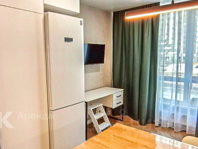 Интерьер квартиры бесшовно разделен на прихожую, гостевую, рабочую и кухонную зоны. Квартиры оснащена вместительным гардеробным шкафом, просторной системой хранения с сейфом, полноценным рабочим местом с компьютерным столом, полкой для книг и аксессуаров. В гостевой зоне расположены телевизор Hisense 55" и полноценный двухспальный диван 1,6 на 2 метра с независимыми сидениями. В кухонной зоне - барная стойка выполнена из массива ясеня, а вся бытовая техника представлена линейкой Hayer и включает: варочную поверхность, вытяжку, встроенные духовой и винный шкаф, микроволновую печь, посудомоечную и стиральную машину с сушкой, напольный отпариватель, кофе-машину и умный чайник.
