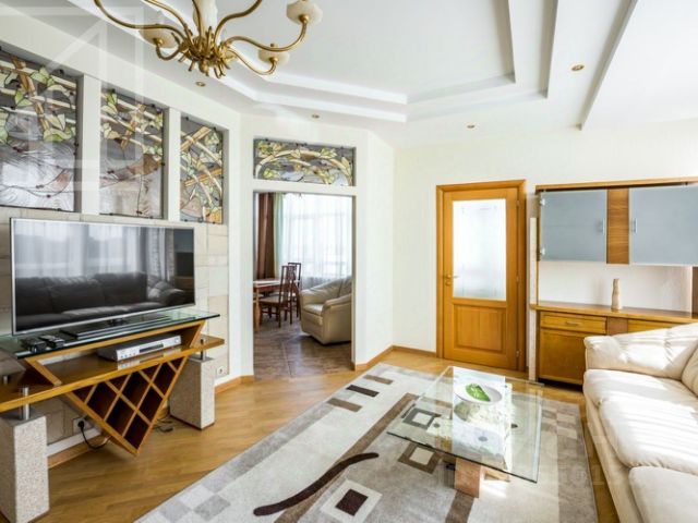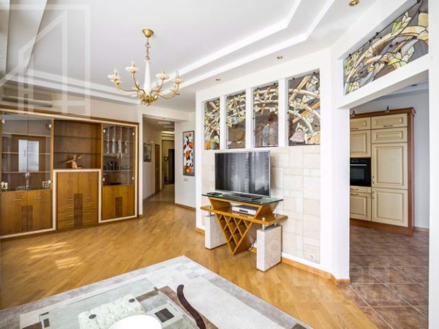 - Кухня-гостиная: современный кухонный гарнитур со встраиваемой бытовой техникой (духовой шкаф, холодильник, варочная панель, посудомоечная машина, кофе машина). В гостиной расположен обеденный стол, диван, выполненный по индивидуальному заказу, телевизор, винный шкаф.