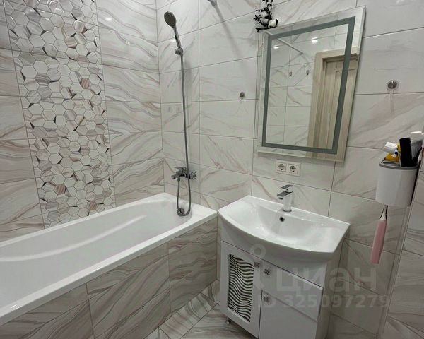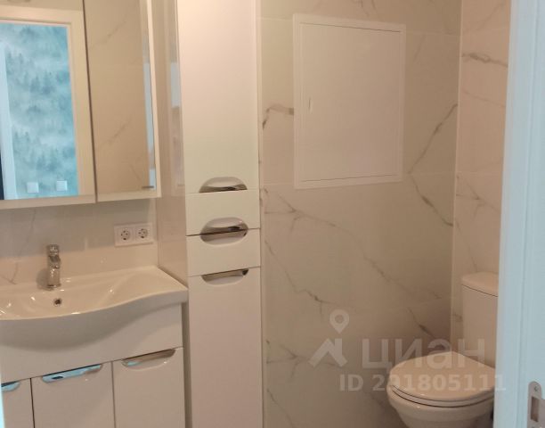 Ванная из литьевого мрамора, качественная сантехника, встроенный тропический душ с мягким поливом, гигиенический душ, стиральная машина Candy с функцией сушки и глажки.