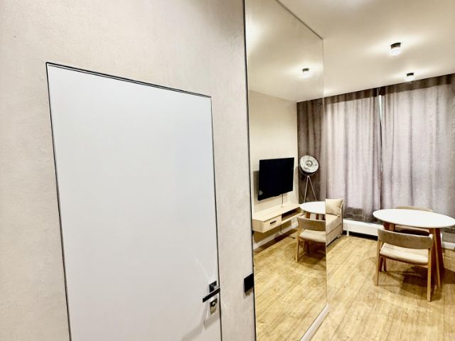 Планировка-трансформер: Кухонная зона отделена от спальни. Это редкость для студий. Здесь нет чувства, что спишь на кухне. А еще — две полноразмерные встроенные гардеробные ниши. Все вещи убираются, пространство дышит.