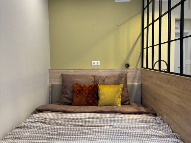 Кабинет: раскладной диван (может использоваться как полноценное спальное место), рабочий стол со стулом, вместительный шкаф для хранения вещей, напольный торшер. Помещение легко переоборудовать в детскую комнату или дополнительную спальню.
