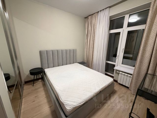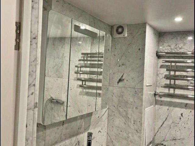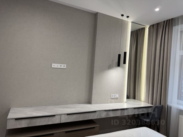 Спальня: двуспальная кровать с подъемным механизмом, 2 встроенных платяных шкафа, туалетный столик. Реализована сложная система освещения с бра и светодиодной подсветкой по низу