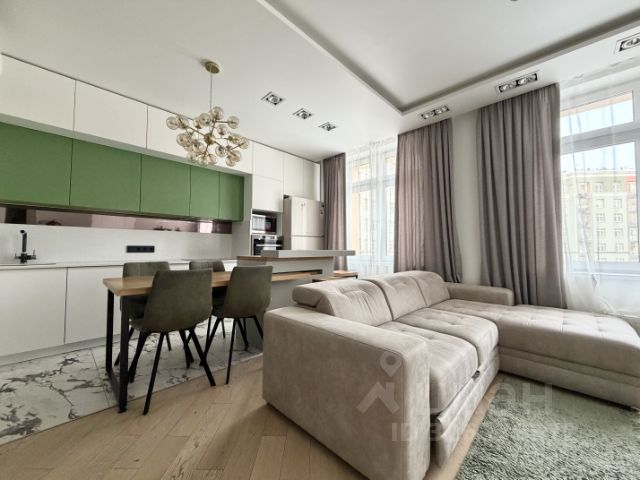 Кухня-гостиная: угловой диван (раскладывается), обшитый текстилем под замшу, кухонный гарнитур до потолка с множеством ящиков, барная стойка со стульями. 3 сценария освещения для любого настроения.